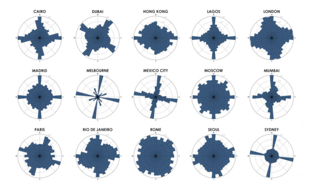 Geoff Boeing, Urban planning professor at Northeastern University, has developed a tool to visualize the consistency of a city’s street network. Boeing’s tool calculates what percentage of a city’s roads run along each section of a compass, and plots it on a circular bar chart. A similar concept was created recently by data scientist Seth Kadish.