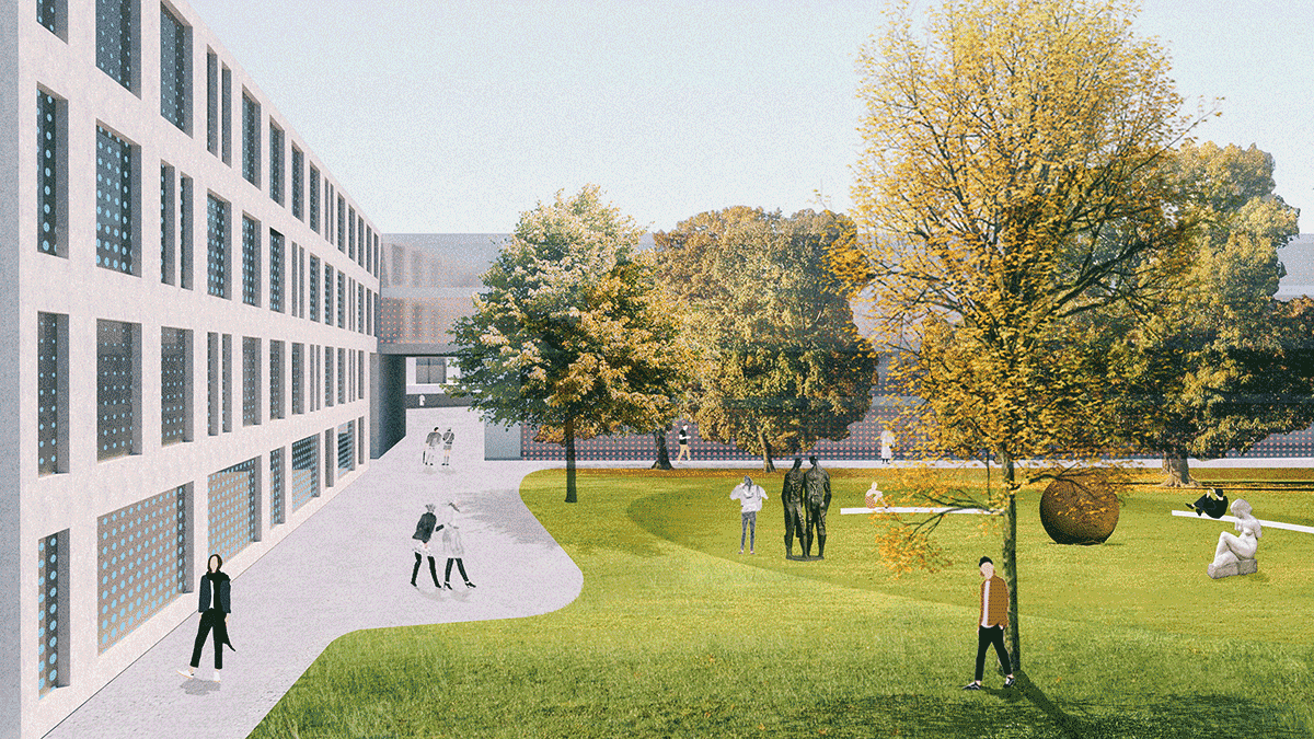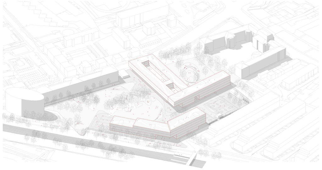 The existing city block is fragmented, the area seems as its development remained stuck somewhere in time, so new interventions are necessary to avoid further degeneration of the place. The new urban design establishes a dialogue with the existing and continues the indicated shape of city blocks with new volumes. The buildings of the Academy of Fine Arts and Design and the Secondary School of Design and Photography conclude a street tissue, creating an important spatial quality on the site of degraded green areas – a new green city square. This is a move that, alongside a hybrid design approach, forms a hybrid of meadow, landscape, and the classic square. It is a necessary city-creating intervention as it not only opens the space but also brings the potentials of an open urban gallery.