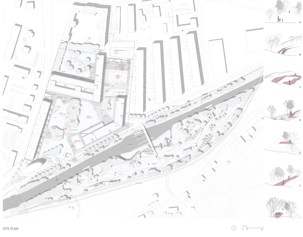 At the same time, the vacated space between the built gives the new buildings of educational institutions well-deserved importance. A green square with a concave focus is an opportunity to visit, meet, see, think and imagine the art and design. The landscape thus represents a green passe-partout to the surrounding buildings. The green square itself is an example of a typological rarity, so it can be a flag-bearer of a new wave of the greening of public space in the city – an opportunity and a challenge that should not be missed.